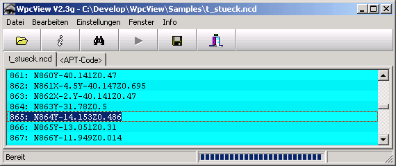 Umgekehrt können Sie ein NC-Satz im aufgelisteten NC-Programm anklicken und WpcView zeigt Ihnen in der Bildschirmgrafik sofort die zugehörige Fräsbahn im 3D-Raum.